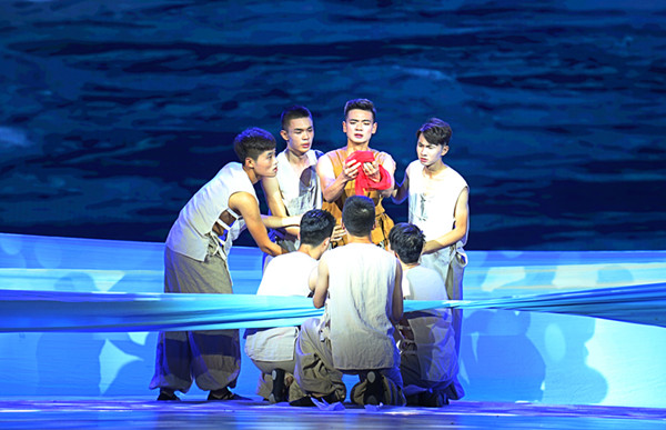 第二篇章“红土映日”展现了黄冈土地上人民揭竿而起的场景。1927年黄麻起义爆发,男女老少人人拿起武器,为保卫家园进行艰苦卓绝的斗争。“小小黄安,人人好汉。铜锣一响,四十八万。男将打仗,女将送饭”,演出者精湛地演绎出了当年黄冈人民全民上阵齐抗敌的感人一幕,拳拳爱家爱国之心让观众们动容。演出尾声,表演者通过原创歌舞表演《红安红》等,展现了几十年前董必武、陈潭秋等革命先辈点燃黄冈革命火种,到如今黄冈人民薪火相传至今仍生生不息的红色精神。演出在观众经久不息的热烈掌声中落下帷幕。